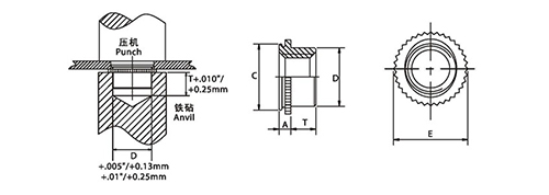占微小空间的高强度螺母,FE、FEO、UL是自锁螺母,FE、FEO抗扭转符合美国军工25027标准要求。坚强的环齿锁深压入板内,使螺母与板成为一体产生强大的抗扭转性能,填满后的凹槽产生强的抗拉出力。螺母表面涂有干燥光滑的润滑膜,保持其长期的稳定性。使用时,最少拧进2圈才能拉紧。
